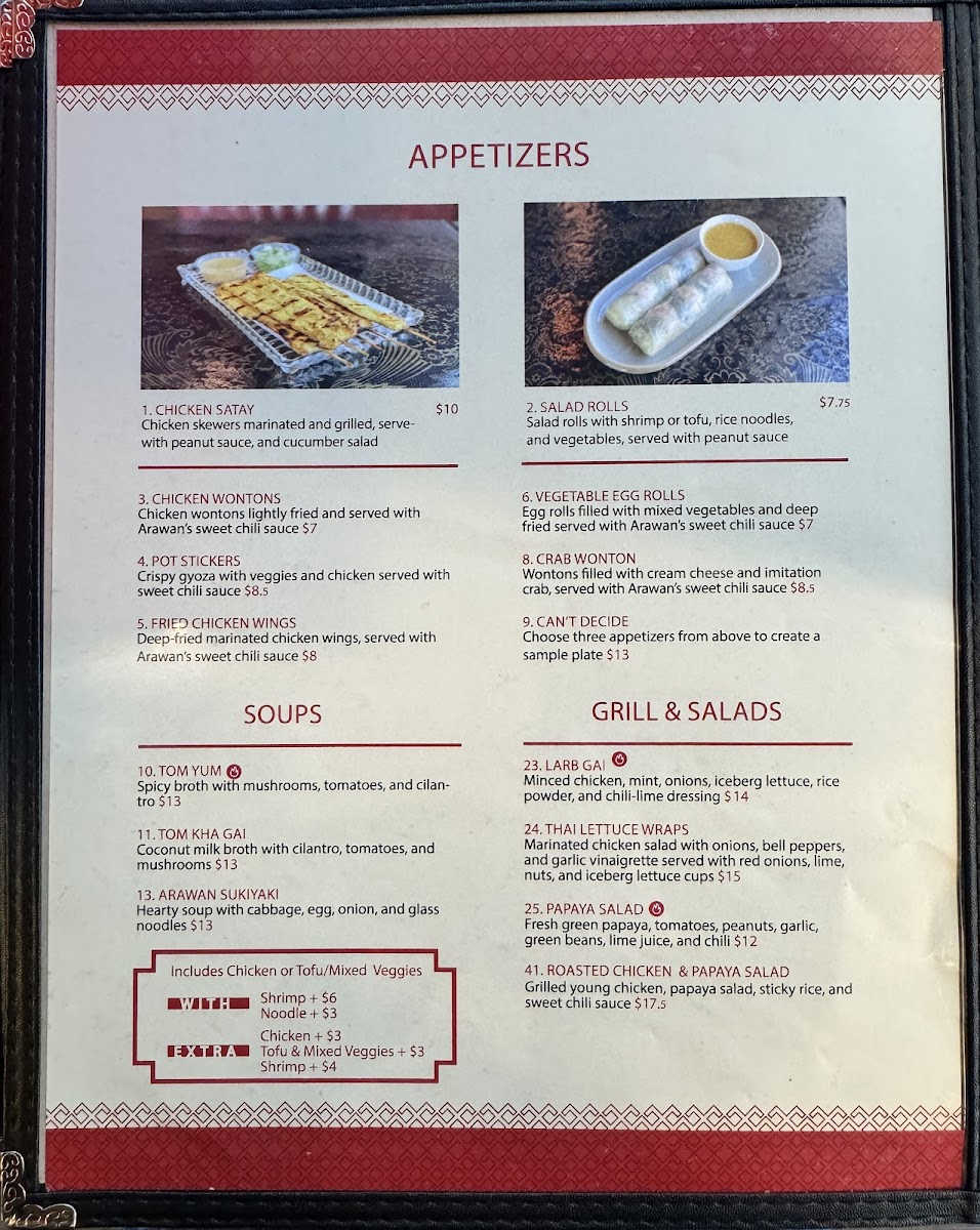 Six wontons filled with cream cheese and imita- tion crab, served with Arawan’s sweet chili sauce.